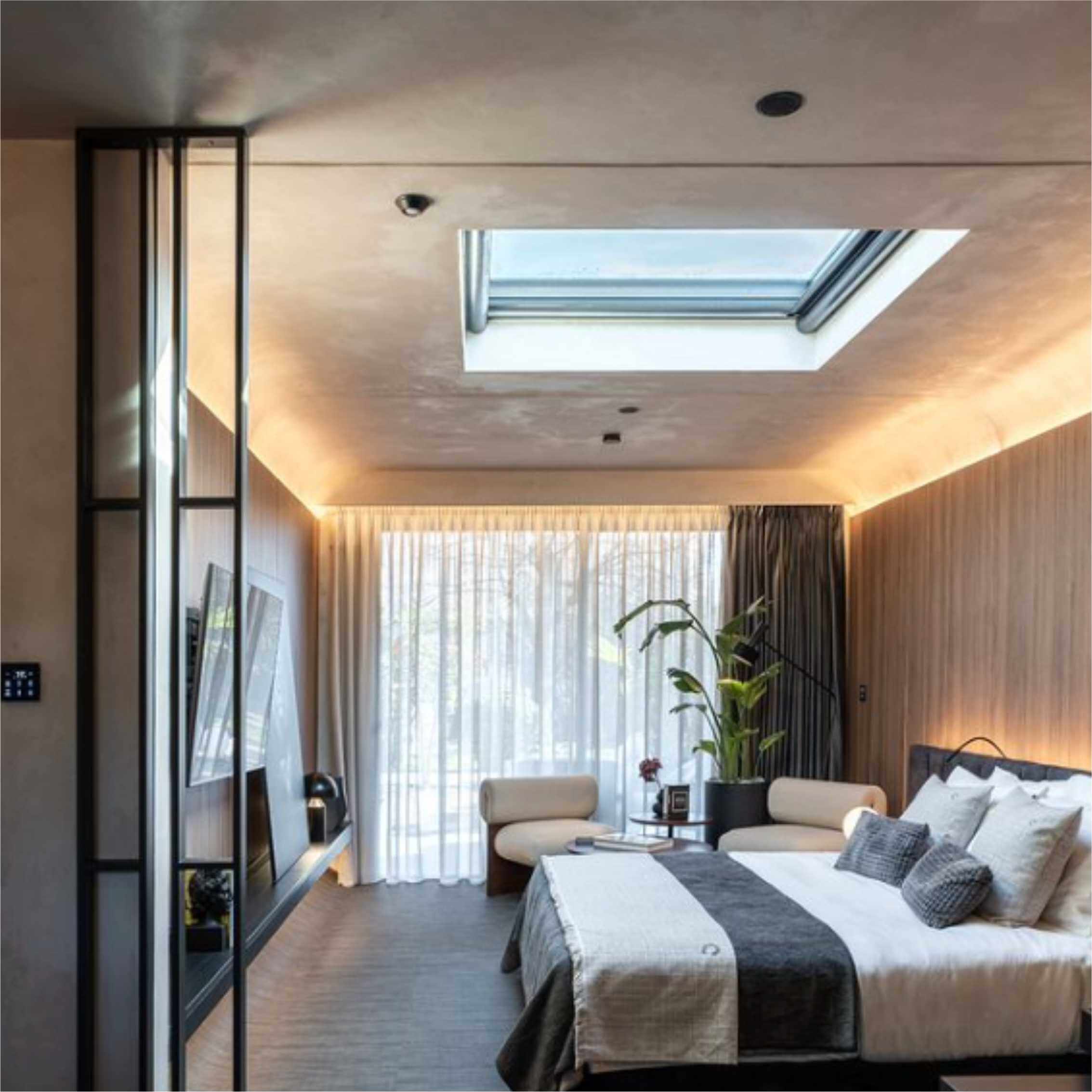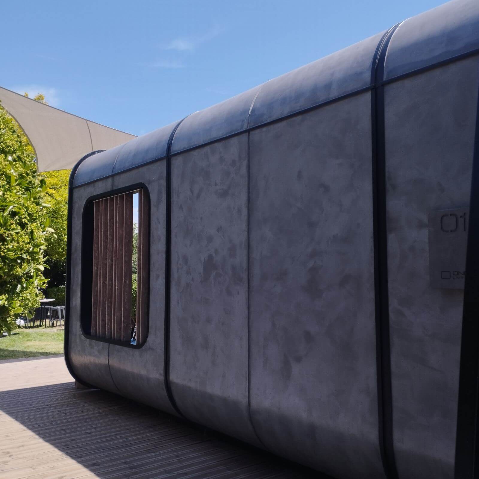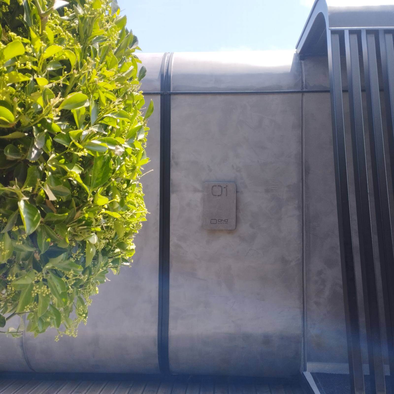 Για την εξωτερική επένδυση εφαρμόστηκε το σύστημα Nanostucco 500 microcement σε απόχρωση Grey, ενώ εσωτερικά στην οροφή χρησιμοποιήθηκε το σύστημα Element 10 σε χρώμα Vanilla, προσφέροντας μια μινιμαλιστική και σύγχρονη αισθητική.
